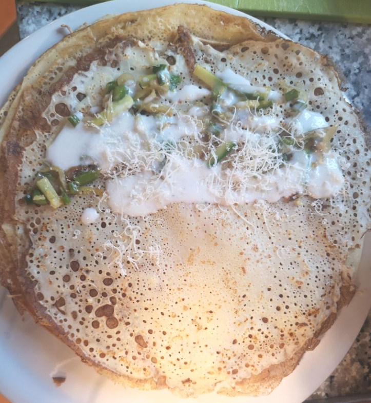 - Stuff the crespelle: put a few spoons of bechamel on half of the crespella, add a spoonfull of vegetables, and another spoonfull of cheese sprinkled on top. Fold the empty side over the stuffed side (you’ve folded it in half), and then fold it over itself again (you’ve now folded into a quarter with a 90° angle). Repeat to stuff all of the crespelle, keeping in mind you need to leave aside 6 tbs of bechamel, 2-3 tbs of cheese, and 4 tbs of veggies to top the finished product.