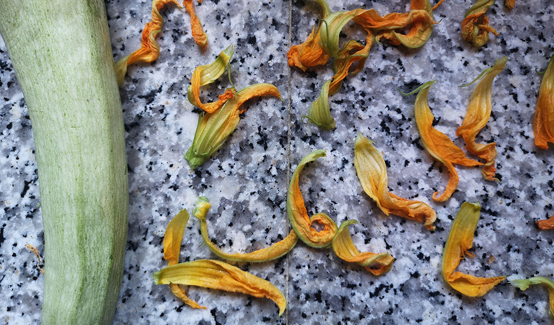 - Place the remaining whole zucchini blossoms on top, then little pieces of the 2 tbs of butter you’ve set aside, and a pinch of salt.