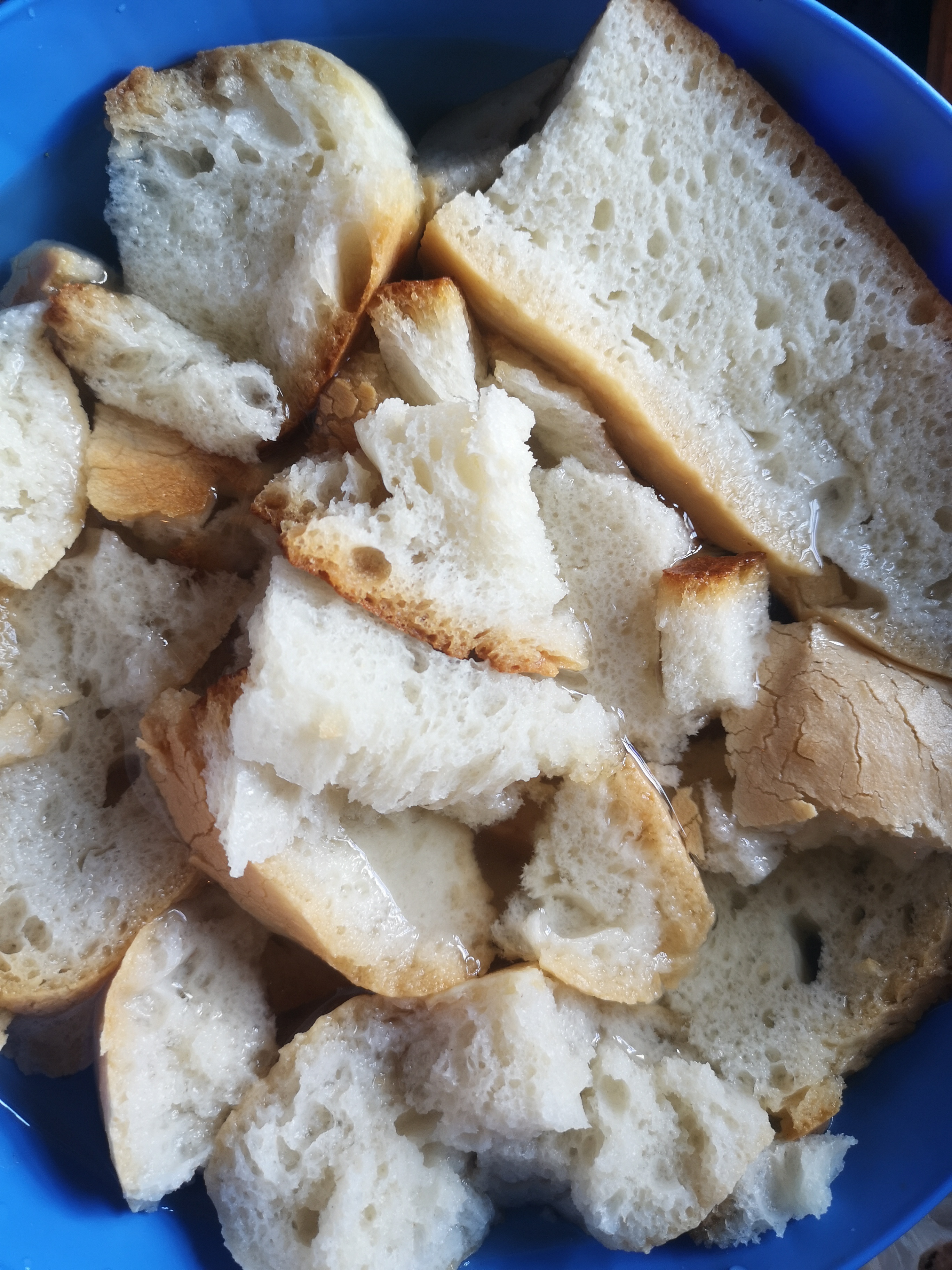 Put your bread in a big bowl and cover with water. Let sit until the bread soaks up the water, gets soft, and should double in size.