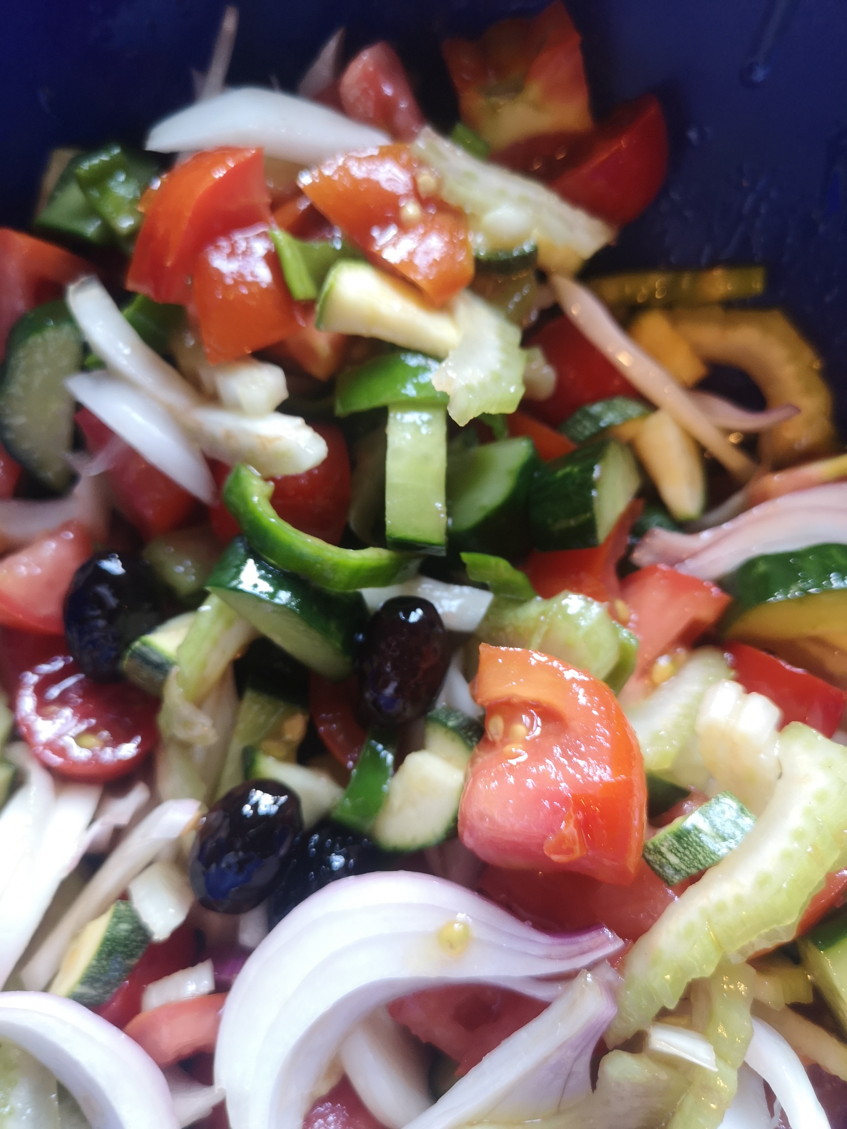 Chop all of your veggies (again, whatever summer vegetables you have around will do, as long as you include tomatoes). Toss them in a big bowl with the salt, vinegar and oil.