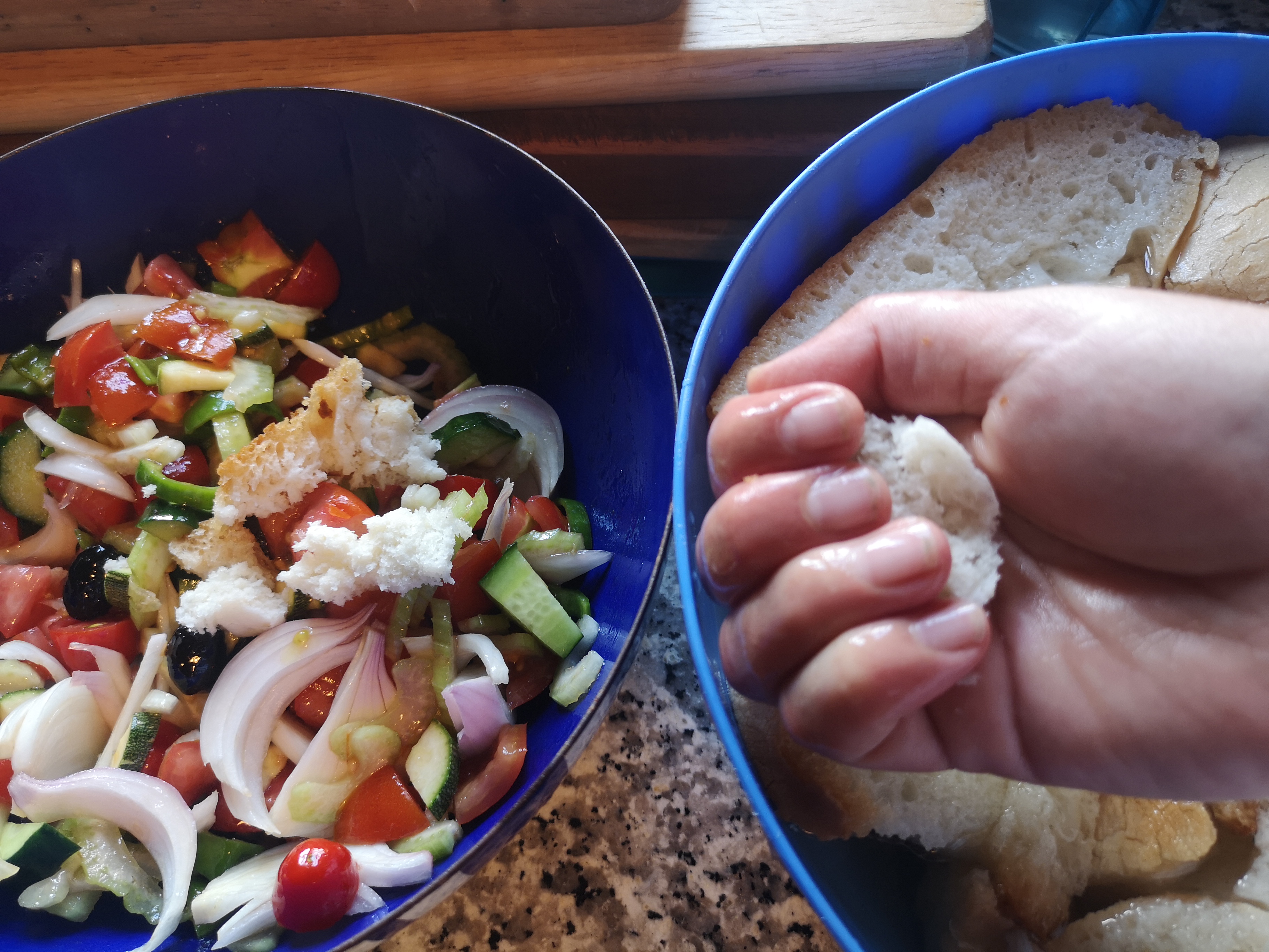 3. Mix your veggies with salt before adding the bread so they leak out their delicious juice that will be soaked up by the bread.