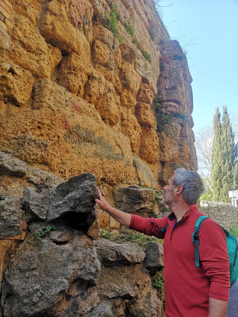 The itinerary is just over 4 km (about 2.5 miles) and leads from the Roman Theater down into a valley called Valle (literally “valley” in Italian), and then back up to the Etruscan tombs in the Marmini necropolis; from there we took a short tract of the Via del Sale (“Salt Road”), and then headed back to the center of Volterra, passing through the Etruscan gate Porta Diana, by the cemetery, and had an awesome view of the recently-discovered Roman Amphitheater as we did the final climb up the hill to Volterra.